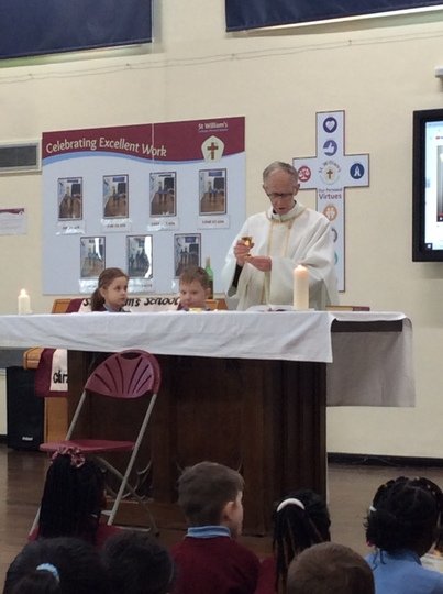 Our Parish Priest, Fr Jones, visits us regularly. He celebrates mass at St William’s church with individual year groups. This helps the children to understand the meaning of the mass and the importance of celebrating the Eucharist. He discusses the Catholic faith with the children and encourages them to ask questions.